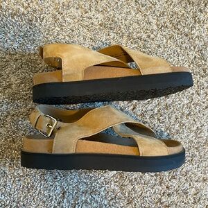 Criss-cross straps across the foot, secured with an adjustable buckle closure.