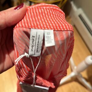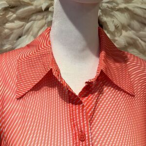 This shirt is so versatile. Can wear it with your bikini top and Jean shorts. Pair it with jeans and sneakers or go out with a bralette underneath. It has a retro feel to it. I would say color is a red/orange. Can’t go wrong with this purchase.