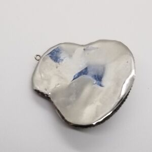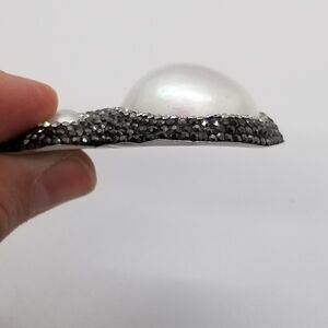 Fun oversized sparkly pendant with baroque pearls (I think - might be faux) pieces in the shape of a paw print. The pearls are surrounded by clear/silver rhinestones, and the rest of the space is filled with dark gray rhinestones. Thin sheet of shiny silver toned metal on the back. Small loop at the top that can be attached to a jump ring to put on a necklace. Probably an artisan piece. Measures approximately 2 1/4" long and 2 1/4" wide.