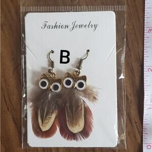 These are the cutest owl feather boho earrings! Burnished gold with big owl eyes make up the top. Patterned dangling feathers make up the body of the owl. So cute! Each feather is slightly different!