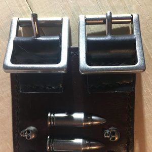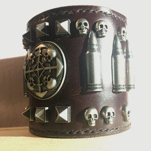 oxblood leather cuff gauntlet with viking compass and bullet/skull studs, double buckle closure. fits 7"-9.5" wrist.