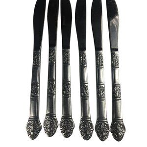 Enhance your dining experience with this set of six discontinued Oxford Hall stainless steel knives. Perfect for collectors and daily use alike, these durable knives offer both style and functionality.