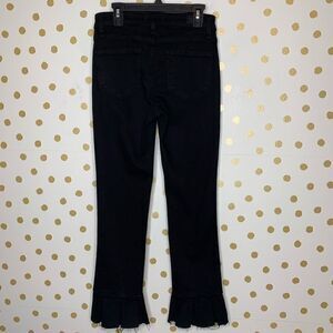 •Features: Black overdye cropped jeans with flare ruffle hem. Fabric has stretch.