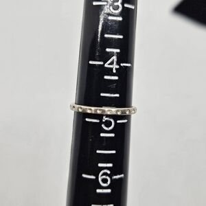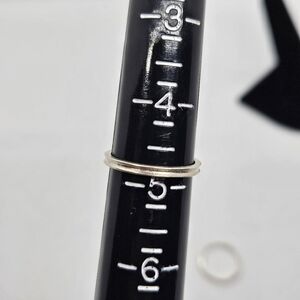 Pair of frosted silver tone metal rings. One has an indented band in the center, and the other has a series of dots in it. Size 4.75 as shown in mandrel photo. In good used condition.
