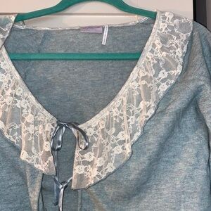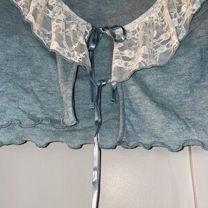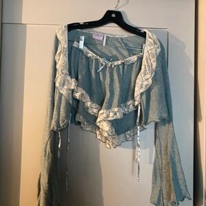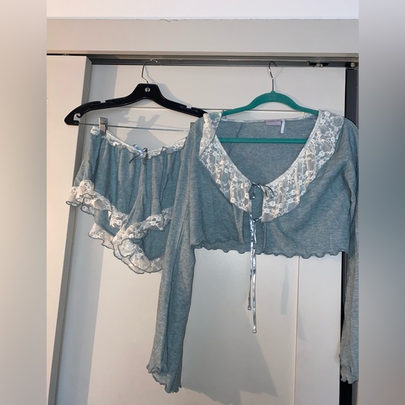 teal front tie long sleeve cabbage sleeve top with matching shorts