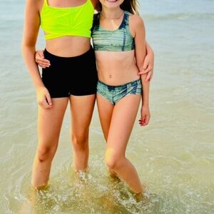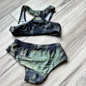 Stylish bikini set with a unique green and black camo/palm tree pattern. Perfect for beach days. Some pilling on bottom see photos