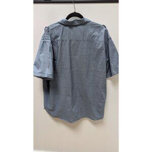paper denim & cloth Blue Striped Button-Down Shirt. Size 3X. Gently used, with a small tear on the left side hemline. It features 2 chest pockets, short sleeves, a collar, white buttons, and button detailing to the shoulders.