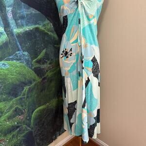description: Rare and sold-out Patagonia Kamala Dress in “Hibiscus Field Howling Turquoise” — a vibrant floral halter midi dress made from lightweight, sustainable fabric. Convertible halter neckline, stretchy bust, and flowy A-line cut. Flaws as pictured but not visible from a distance.