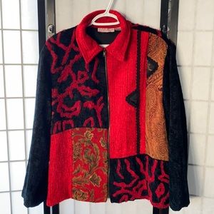 gorgeous red, black, and paisley zip front coat with smooth black lining