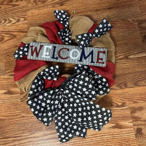 patriotic welcome wreath made with burlap galvanized welcome sign attached approximately 16” x 16” (without hanging bow)