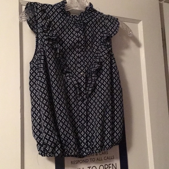 blue and white. ruffle detail on sleeves, collar, and front