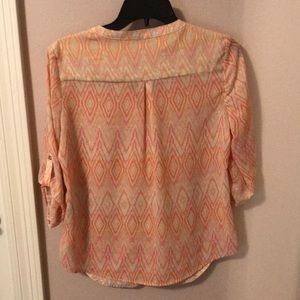 This is a cute and fun patterned blouse. It has orange, pink, and yellow shades. The sleeves roll up and button.