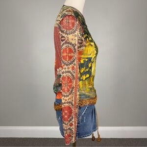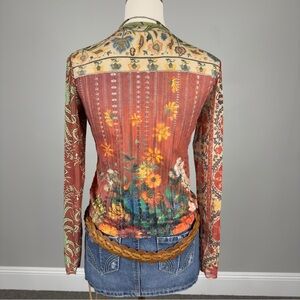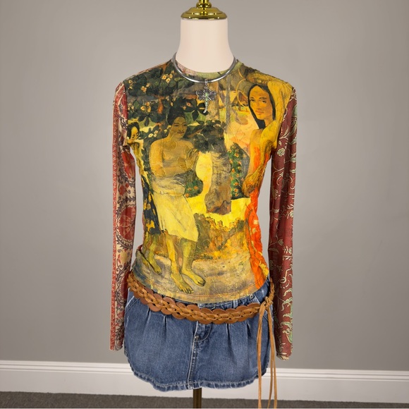 90s / y2k inspired abstract floral patterned mesh longsleeve semi sheer tshirt featuring the artwork “la Orana Maria” by painter Paul Gauguin