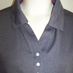it is size XXL this ladies polo shirt it is gray with pink around the neck
