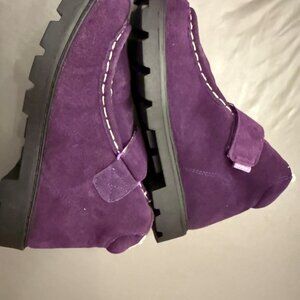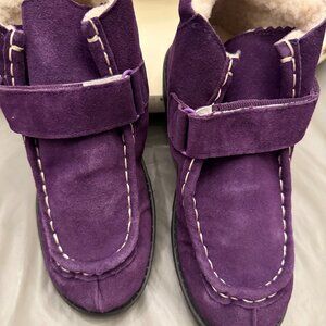 pediped jackie purple suede boots. Lightweight, flexible, non-marking sole. Comfortable, breathable leather lining. Velcro strap for adjustability. Approved by the American podiatric medical association for promoting healthy foot development. Size EU 36 (US 4-4.5). Smoke-free home. Brand new.