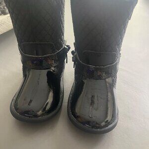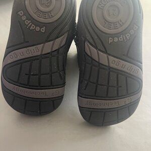 pediped Naomi stylish black boots. Leather and quilted nylon upper. Breathable leather lining. Flexible rubber sole. Boot style with inside zipper. Approved by the American Podiatric Medical Association for promoting healthy foot development. Features include G2 Technology™, specially designed for children transitioning from early walking to walking with a more confident stride. G2 Technology™ includes a soft rubber sole, rounded edges that mimic the natural shape of a child’s foot, heel stability, and a soft toe box that allows toes to curl and grip the floor. Size EU 21 (US 5.5). Brand new.