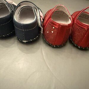 pediped baby girl shoe bundle. Includes Alyssa Red Glitter and Abigail Navy Pink Originals shoes. Both size 0-6 months. Approved by the American Podiatric Medical Association for promoting healthy foot development. Velcro fastener make them easy to put on. Brand new. Smoke-free home.