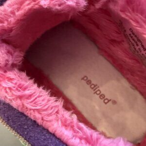 pediped Rosa Purple Originals shoes. Purple suede with pink and green embroidered accent design. Velcro closure for easy wear. Sherpa inner lining. Approved by the American Podiatric Medical Association for promoting healthy foot development. Size 12-18 months. Brand new. Smoke-free home.