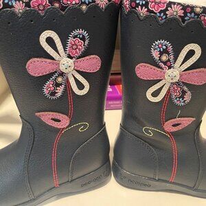 pediped Kenadi boots. Leather upper. Fleece lining. Flexible rubber sole. Fashion boot with beautiful floral design and inside zipper. Approved by the American Podiatric Medical Association for promoting healthy foot development. Size EU 24 (US 7.5-8). Color is Navy. Brand new.