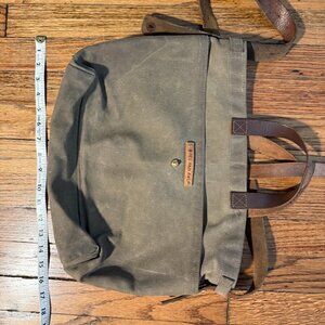first image is a stock photo , this is one has lighter leather at brand area. this one has been used less than three times. Waxed cotton, made to look worn with slight wax marks and tarnish, indigo late 1800s fabriic on inside pockets, leather from old gunslings, no zipper. This one is old batch from older amterials, the new ones have newer leather which is less charming. I have a few of these but selling the underworn ones. PRICE FIRM, a steal at this price and this is a collectors peice since its the older stock.Great pockets fro tech and organizing - I am a teacher and love the pockets for all the features easy to find;. Its also not heavy and easy to carry laptop, pad and weekend or day trip tools.
