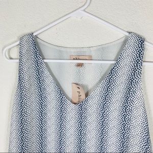 Great sleeveless blouse, perfect for layering, white with blue dotted graphic, full white lining, v-neck