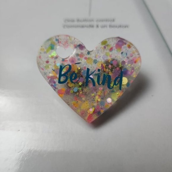 Made with resin and assortment of glitters, including a glow in the dark fine glitter, and vinyl lettering. Pins attached with uv resin.
