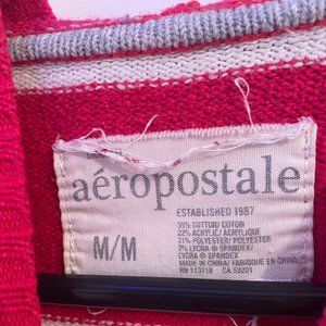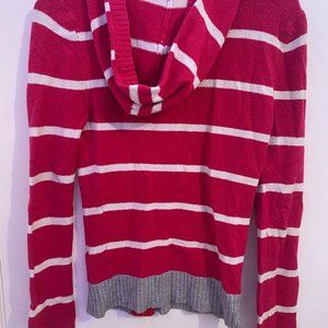 pink and greyish white striped zipper jacket with hood. thick and warm. worn a couple of times.