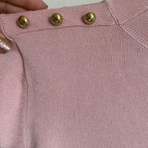pink and grey stripped sweater from retrology with gold buttons on the shoulders