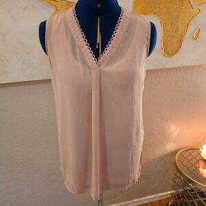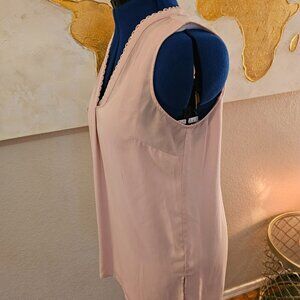 pink blush vneck blouse with loop details around neck and slits on sides