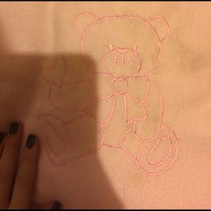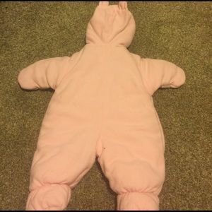 It is a very thick, warm fuzzy snow plush suit. It's pink and has a hoodie that has cute little ears on them. Also a baby bear on middle for design. Unzips from both sides and buttons around the neck. Mittens unfold for free hands