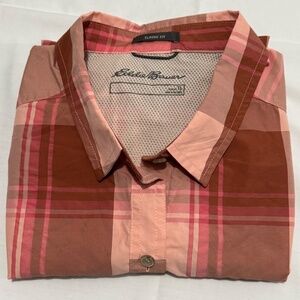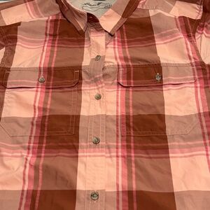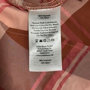 The pinkish/multi color long sleeve polo shirt for women in size TL is a classic fit button-down style blouse from Eddie Bauer. Made of a blend of polyester and nylon, this top features a collared neckline and a tall size fit. The basic style and pink color make it a versatile piece for any wardrobe, suitable for everyday wear or dressed up for a more formal occasion. The fabric type "down" likely refers to the use of a down alternative in the construction of the shirt, providing warmth and comfort without the actual use of down feathers.