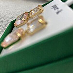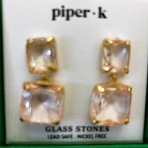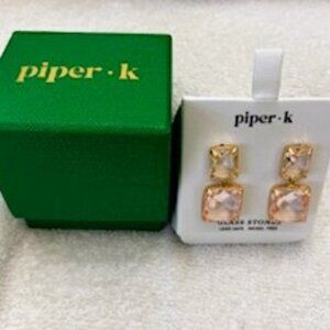 piper k brand pierced earrings in blush colored square stones in a 'drop' style. These baby pinkish stones are faceted beautifully to catch the light and the gold tone posta are remarkable in they they have the metal disc that aids in keeping the earring flat against the earlobe (pictured). The top stone is more of a rectangle and measures appx 1/2" wide and 5/8" high. The larger, square drop stone measures about 3/4" x 3/4" and both stones are set in gold tone metal with the four prongs at each corner of the stone. Piper K describes their affordable jewelry line as blending "trend-driven designs with timeless appeal, offering pieces that feel fresh yet never go out of style. From whimsical seasonal collections to everyday essentials, each item reflects a balance of creativity and classic beauty." Never been worn/New in the Box