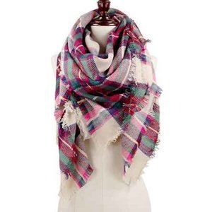 multi-colored plaid blanket scarf with fringed borders. Never worn.