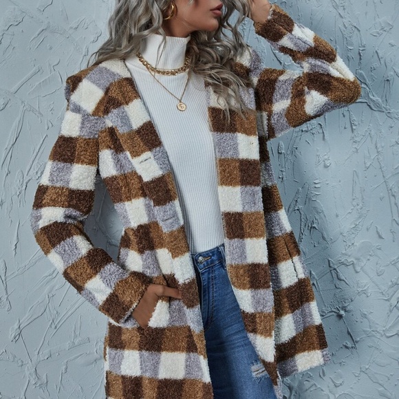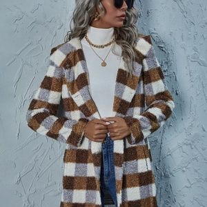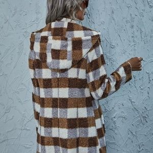 plaid brown mocha pocket hoodie teddy jacket coat