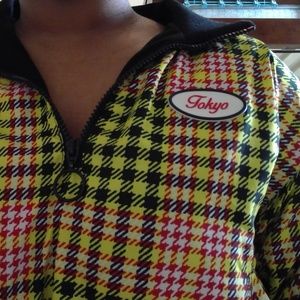 this jacket is a really cool pattern and super cute. the decal says 'tokyo' on it. the zipper is a black O ring. the inside is a gauzy material. worn twice, good condition.
