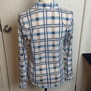 Blue, white, tan button down flannel.