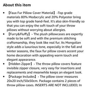 These pillows are so fluffy and easy to take care of. Throw it in the wash and it comes out just as new. I have them in almost each room of my home. The listing is for a set of 2 pillows and each does come with the insert. They sat on my bed for a few months but am re decorating and it doesn’t work anymore20x20”
