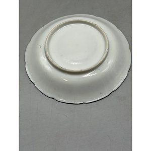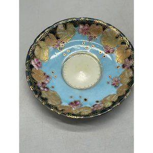 plate saucer black rim gold leaves pink flowers blue center 5" glass emboss READ