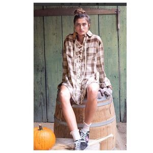 A fun front lace-up strappy shirt featuring plaid fabrication throughout the garment, Designed in a relaxed fit with long sleeve for feminine look and finished with slit on the side of the body hem
