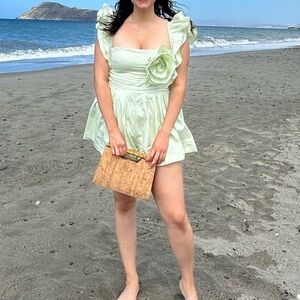 Poplin romper, ASOS LUXE romper, ruffle sleeve romper, corsage detail romper, soft green romper, pastel green romper, sage green romper, elegant romper, statement romper, dressy romper, summer outfit, spring outfit, wedding guest outfit, brunch outfit, short jumpsuit, chic romper, trendy romper, fashion-forward romper, structured romper, feminine romper, floral accent romper, romantic style, soft pastel romper, puff sleeve romper, ruched romper, stylish playsuit, green playsuit, lux romper, luxury romper, ASOS premium romper, ruffel sleeve romper, ruffle sleve romper, corssage detail romper, popplin romper, ASOS rompr.