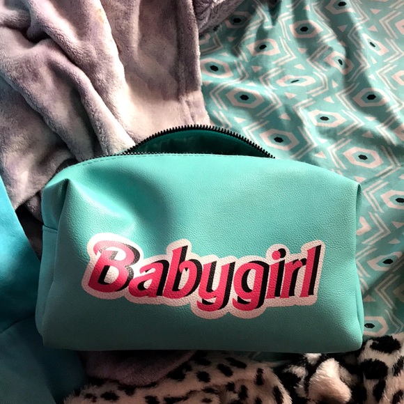 (🦋)its blue with pink ,white ,& black writing that says “babygirl” .