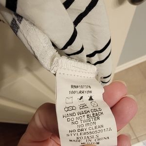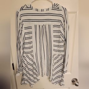 Gentle a-line silhouette through body length, falling lower along sides than at front and back. Stripe print in contrasting directions throughout.