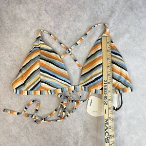 - Triangle swim top, Multi stripes, Moderate support, Minimum coverage, Adjustable tie closure, Removable soft cups