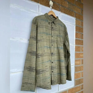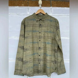 Prana Broderick button front shirt Green abstract design Extra buttons on the inside tag One breast pocket in excellent condition