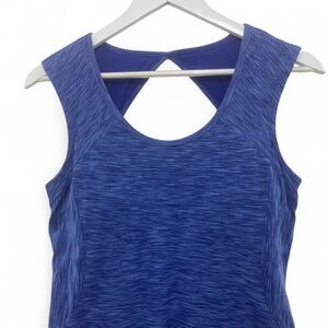 Details: Cobalt blue space-dye heather | 85% Polyester, 15% Lycra | Gently used with stain (see pics)