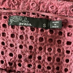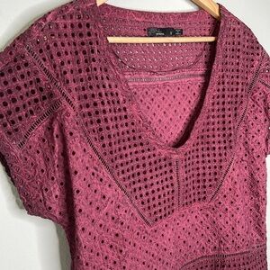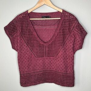 prAna Eyelet Embroidered Cropped Short Sleeve Blouse in Wine Red Size Small NWOT