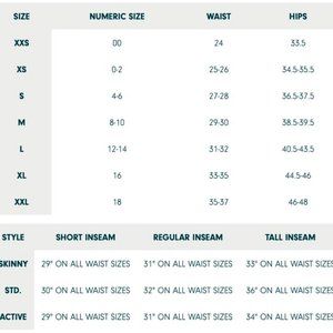 - Offered in 3 inseams: short 30" (76.2 cm), regular 32" (81.3 cm), tall 36" (91.4 cm)