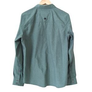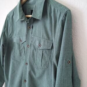 prAna men's shirt size medium long sleeve green cell number M2Asce115 polyester nylon button front double pocket at chest collared shirt please can be worn long or buttoned up to half sleeve