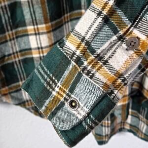 prAna organic cotton flannel in forest green, mustard, and ivory plaid with a brushed texture and chill, oversized drape. Tagged XL. The cut is boxy but not bulky, and the fabric is midweight—structured enough to wear open over a tee or light enough to button up as a layer. No stretch, just broken-in softness that leans more band practice than boardroom. Classic button front, single chest pocket, rounded hem, and Prana’s signature ethos stitched in.
