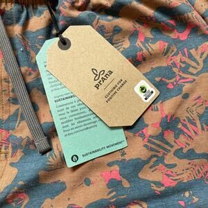 These prAna Metric E-Waist Shorts in size XL are a sustainable, stylish choice made for movement. Featuring a unique earth-toned camo-inspired print with bold accents, they offer a versatile 8" inseam length, recycled polyester blend, mesh brief lining, and secure zip pocket.